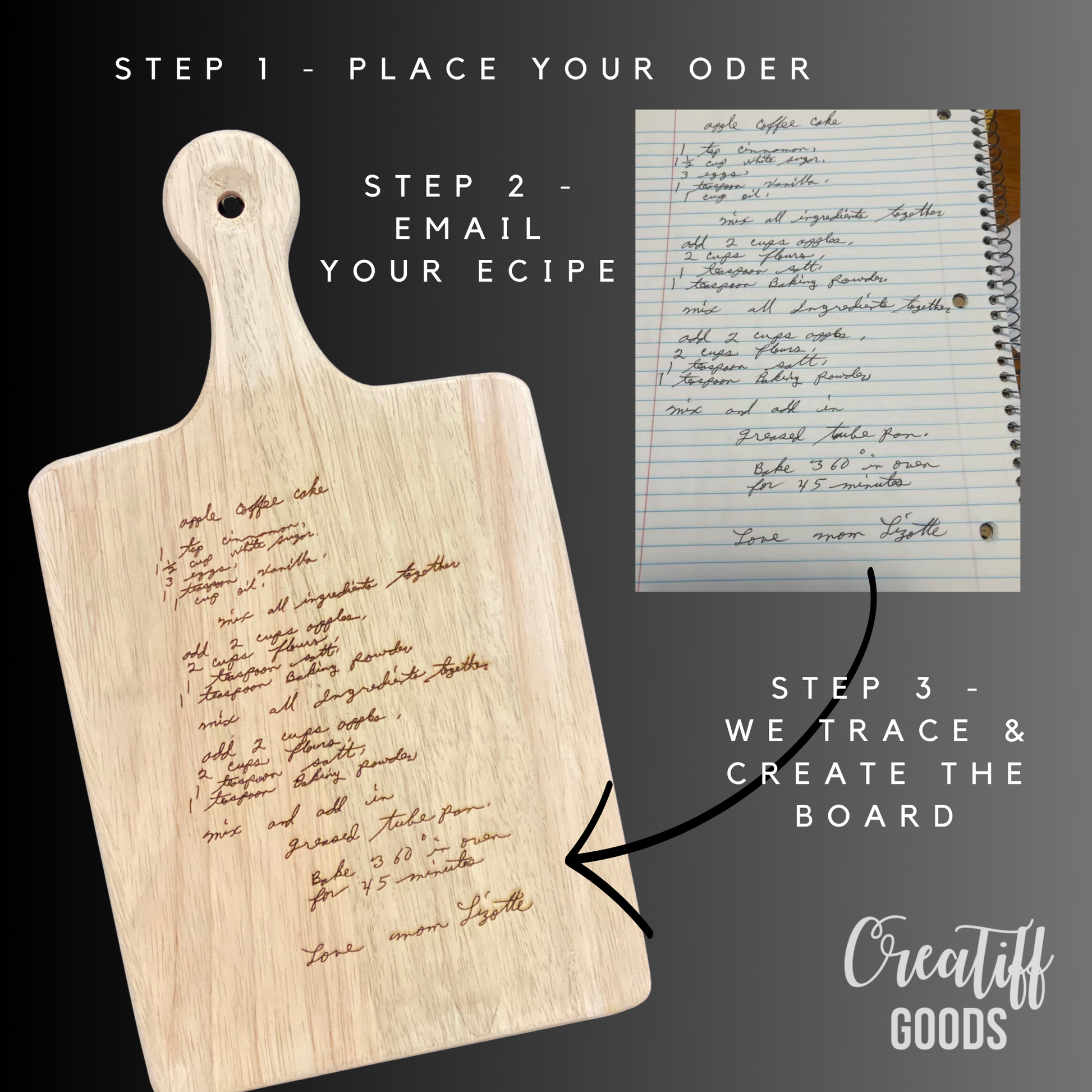 Simply choose your board style, snap a photo of your handwritten recipe, and email it our way.
